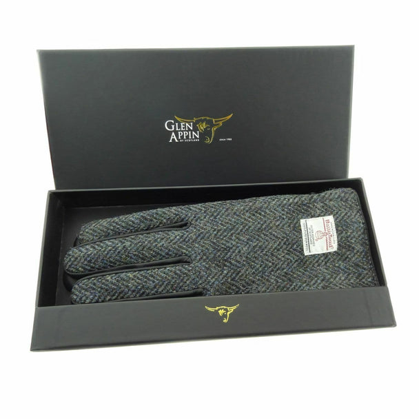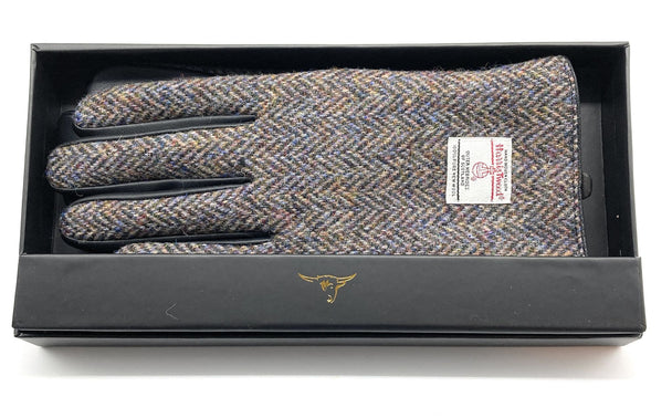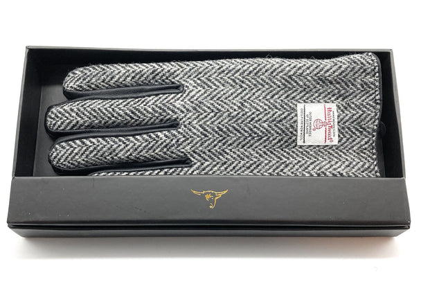 Gents Authentic Harris Tweed & Real Leather Gloves Grey Herringbone