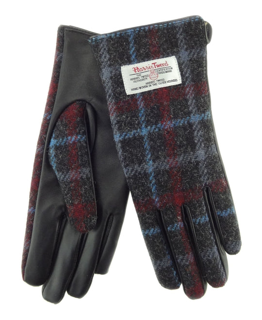 Ladies Black Leather & Authentic Harris Tweed Gloves Charcoal Check/Blue Line