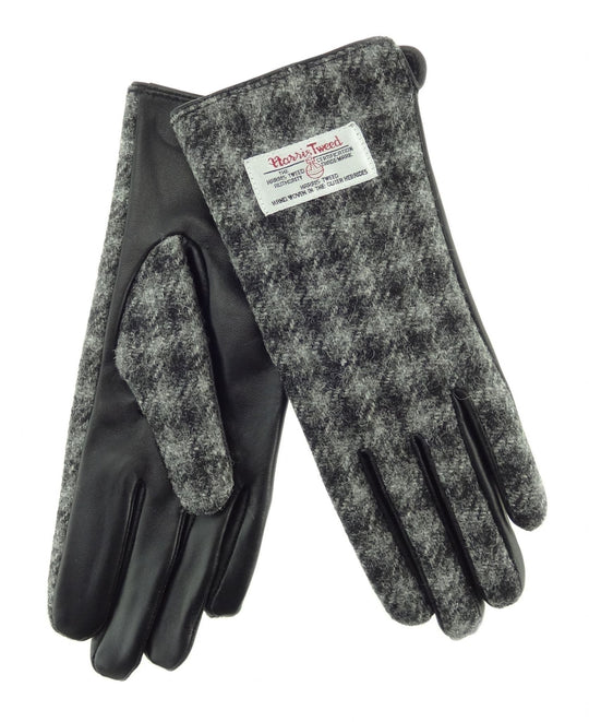 Ladies Black Leather & Authentic Harris Tweed Gloves Grey Dogtooth