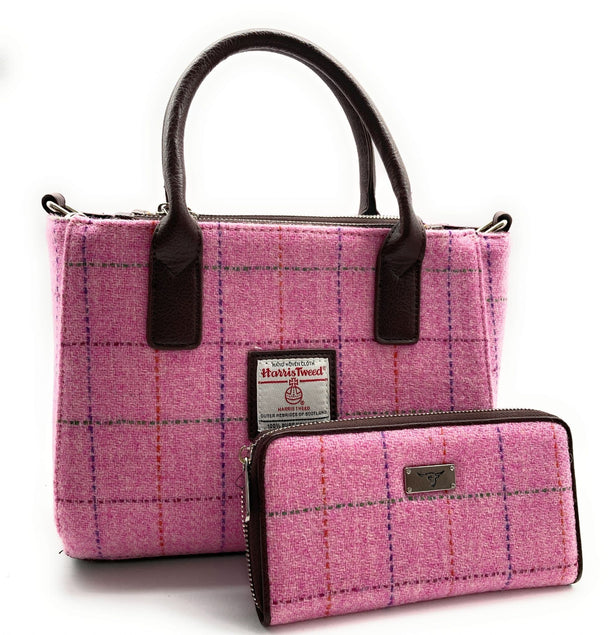 Ladies Authentic Harris Tweed Small Tote Bag & Matching Purse Set Pink Check
