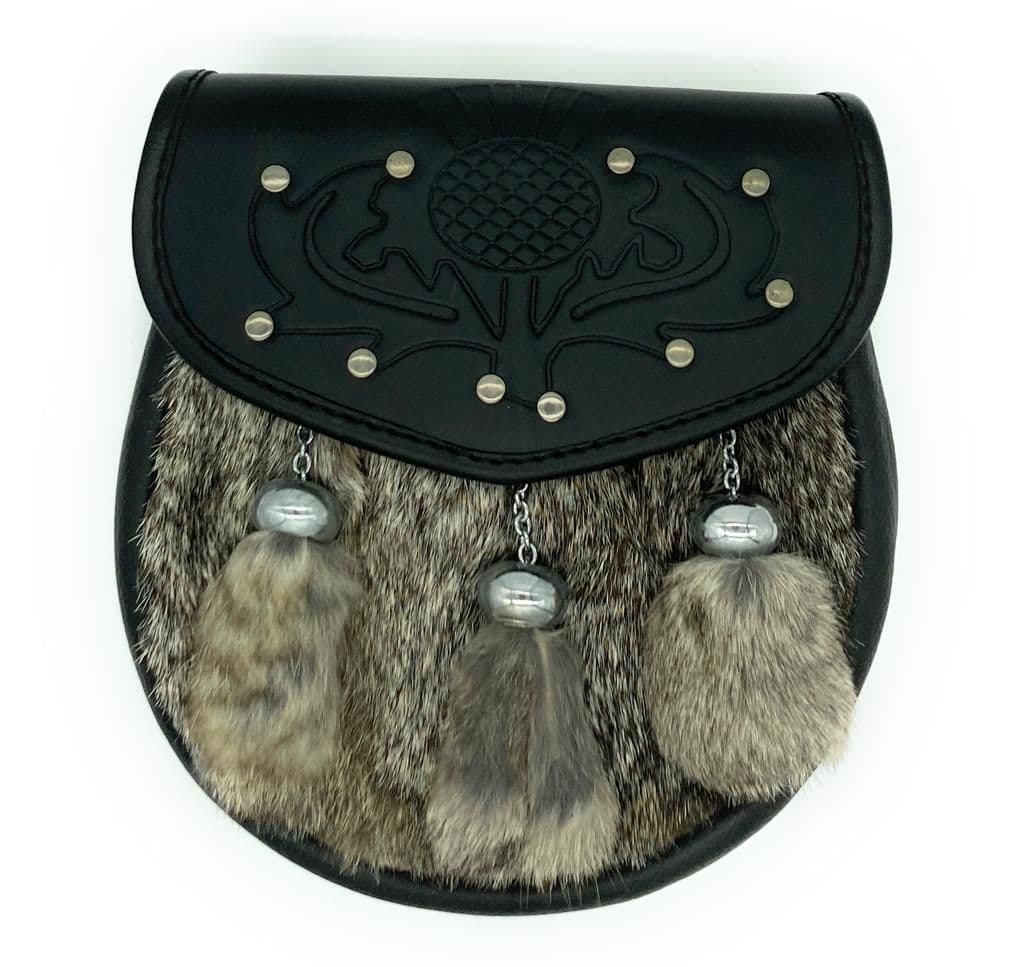 The sporran a traditional part of male Scottish Highland dress, is a pouch that performs the same function as pockets on the pocket less kilt. Made of leather or fur, the ornamentation of the sporran is chosen to complement the formality of dress worn with it completing you Kilt outfit perfectly. The sporran is worn on a leather strap or chain, conventionally positioned in front of the groin of the wearer.